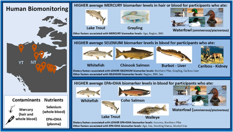 The researchers measured levels of healthy nutrients and mercury in blood and hair samples from community members in the Dehcho and Sahtú regions of the Northwest Territories, located in the Mackenzie River Valley, as well as in the community of Old Crow in the Yukon. Participants also completed dietary surveys about the traditional foods they had eaten over the past year. Using mathematical models, the research team examined whether reported consumption of certain foods was related to the mercury levels measured in people.